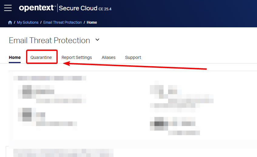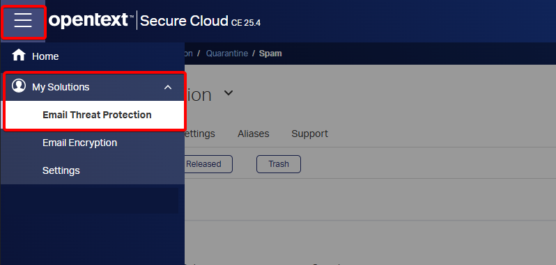 - Navigate to your Quarantine by clicking the 3 lines (Often referred to as a "Hamburger Menu") and then choose "My Solutions" then "Email Threat Protection".