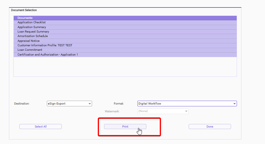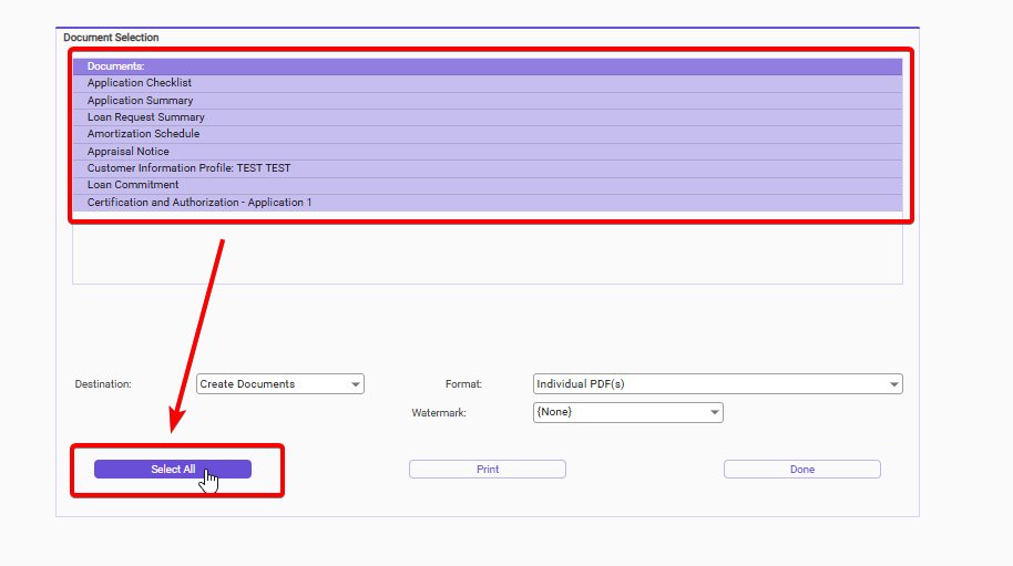 - Select the documents you wish to print by holding CTRL and clicking each one for a custom selection, or click "Select All" for all.