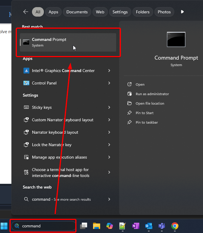 - Open the Command Prompt by searching for it in your windows search bar
