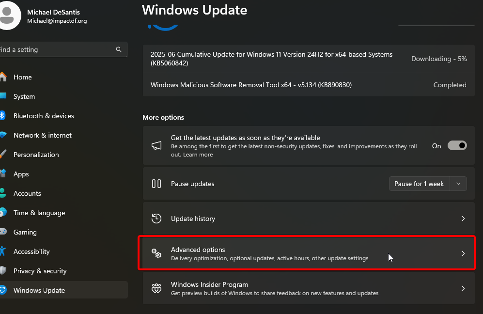 - Under the Windows Update window from above, select "Advanced Options"