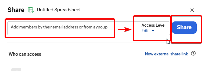 - Type in the name or email address of the user(s) you wish to share with, Choose an Access Level, then click Share: